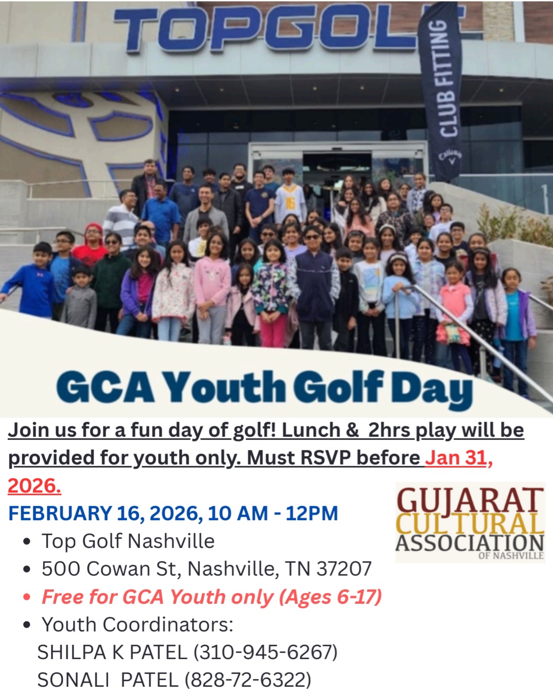 This page is dedicated to various events held throughout the Gujarat Cultural Association Of Nashville If you wish to have an event posted, please email (info@gcanashville.com). Please include event, location, start / end time, contact number and event flyer.